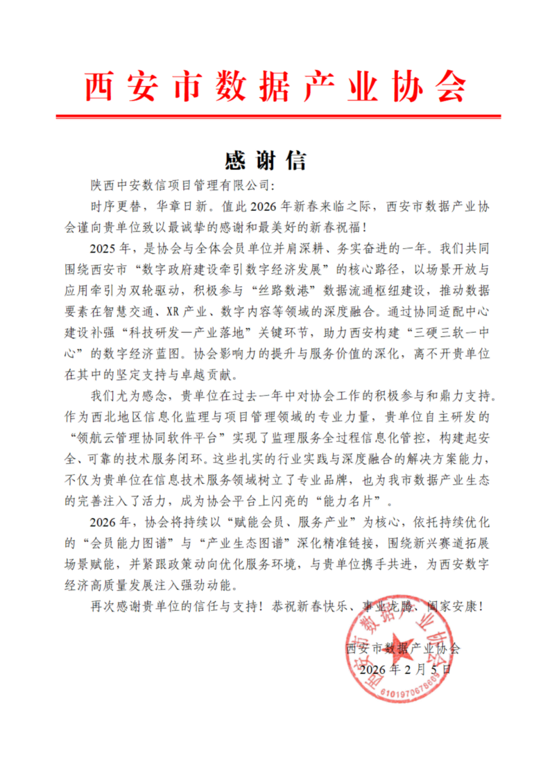 近日,陕西中安数信项目管理有限公司收到西安市数据产业协会发来的新春感谢信,获协会对公司 2025 年工作的高度肯定与诚挚祝福。